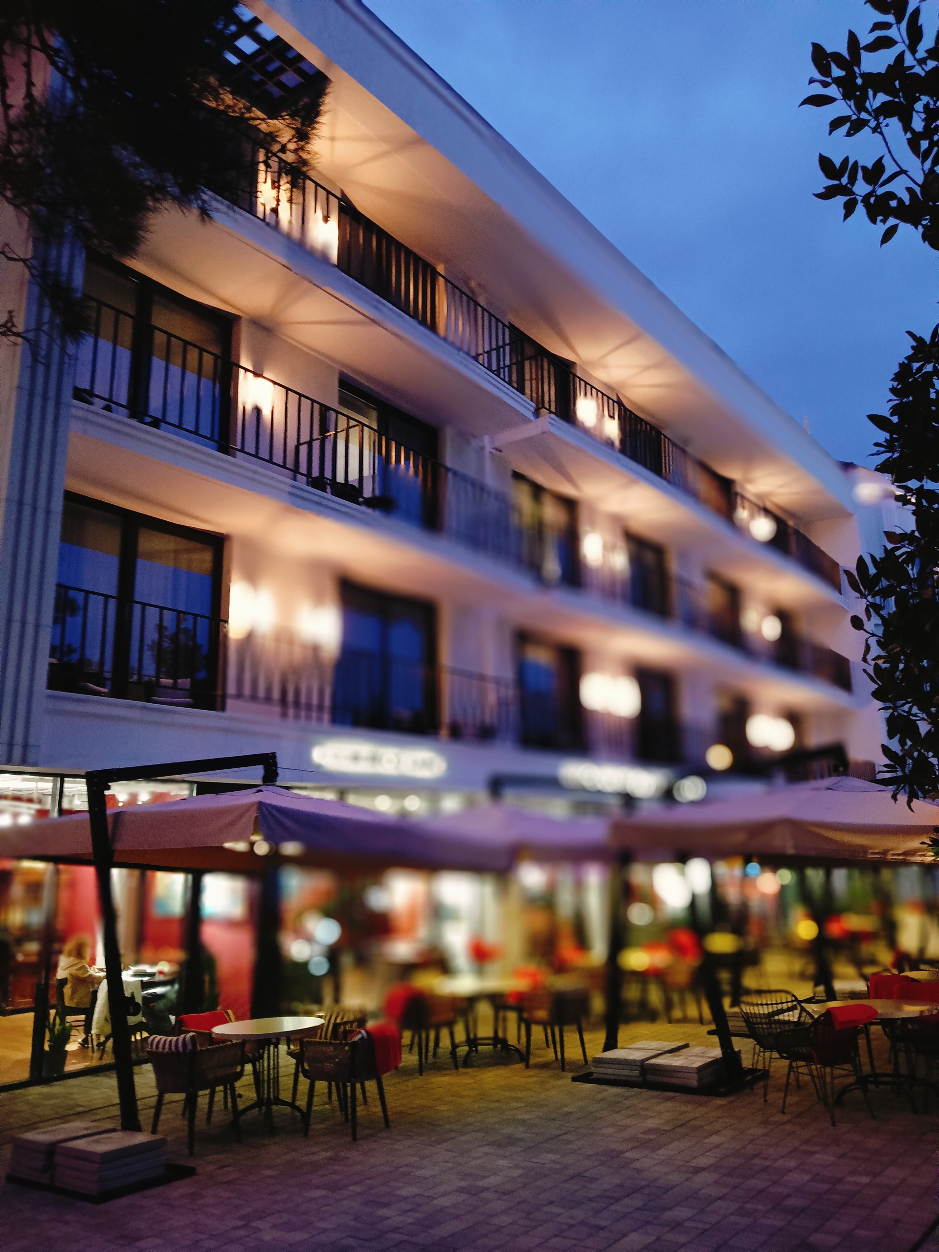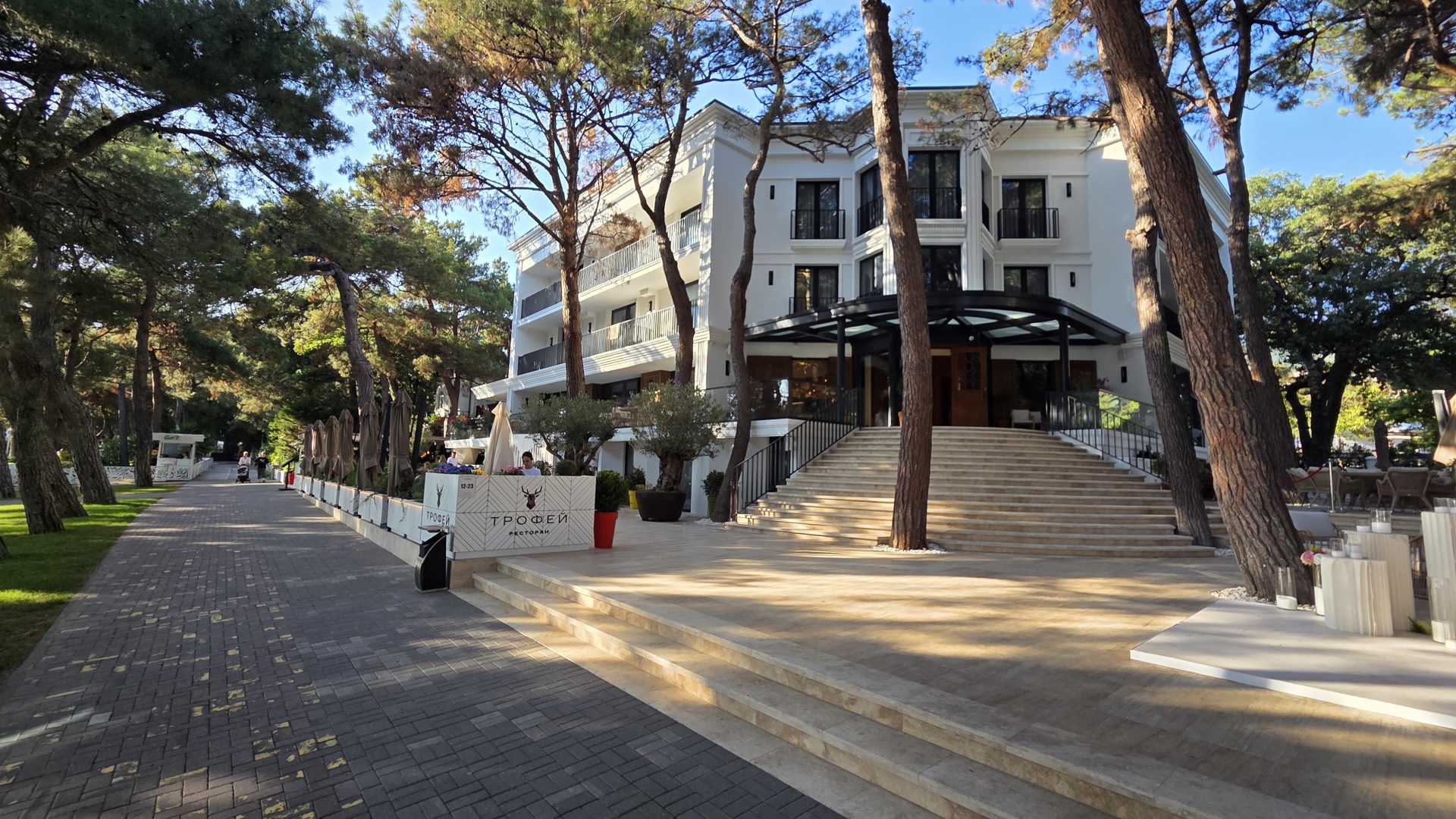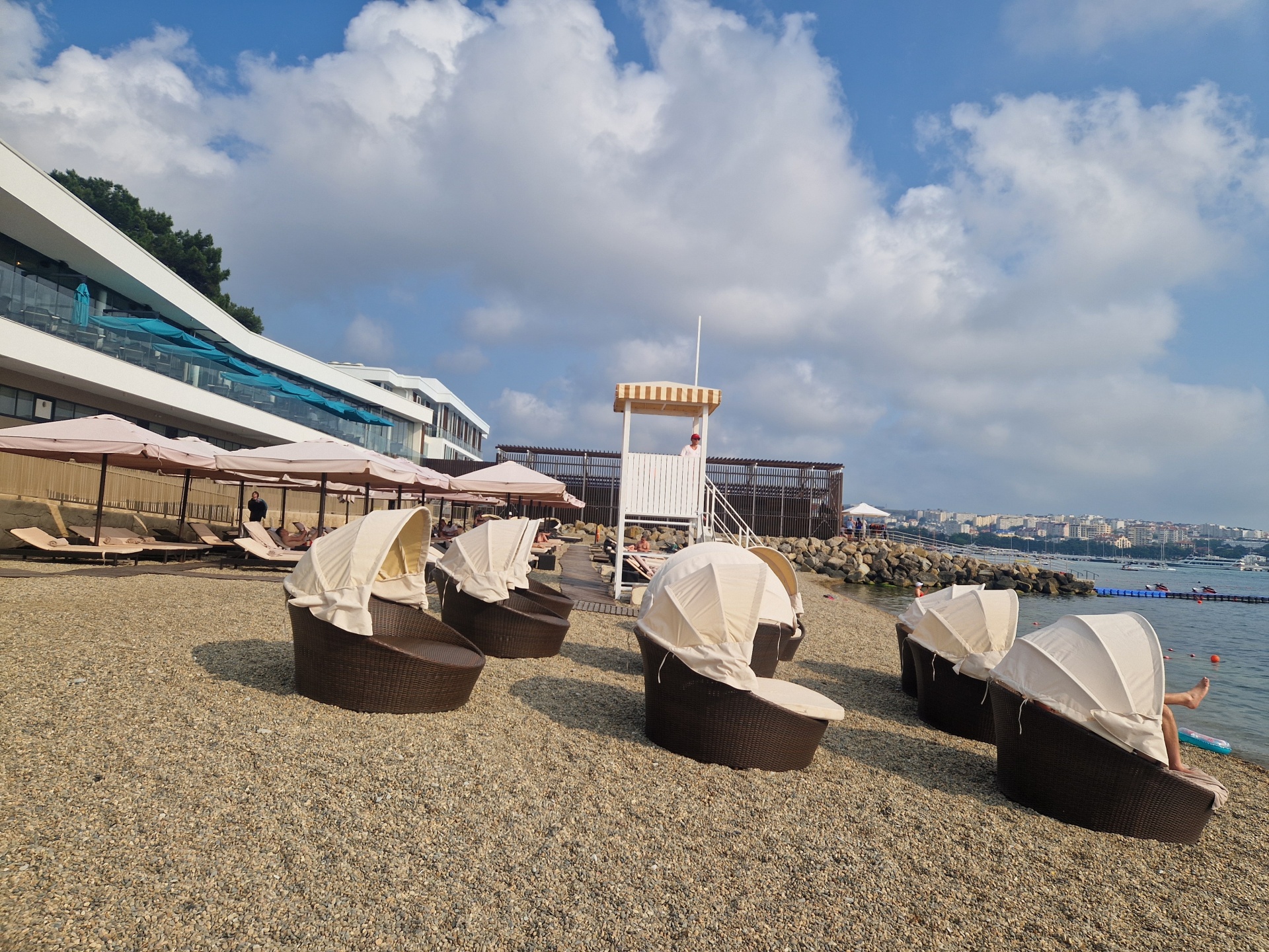 В целом хороший отель. Расположение удачное, до набережной 1минута. Много кафе и ресторанов. Территория отеля ухоженная, симпатичная. Бассейн тёплый с морской водой. Есть сауна. Полотенце и бутылочку воды каждый раз выдавали. Пляж у моря чистый уютный, хорошая раздевалка. Шезлонги зонтики, плетёные ракушки .Мелкая галька, вход в море ровный и хороший, не обрывистый. Рядом ресторан. Номер не новый, но уборка ежедневно, смена белья через день. В номере есть чайник, чайные пары, бокалы и стаканы, утюг и гладильная доска. Тапочки, халаты. Шведский стол нормальный, без изысков, но голодными не останитесь)))) Парковка подземная, 1500 сутки. Персонал молодой, приветливый, отзывчивый. Мы отдохнули хорошо, конечно не в сезон "пиковой"нагрузки, но было хорошо. Можно однозначно вернуться ещё.