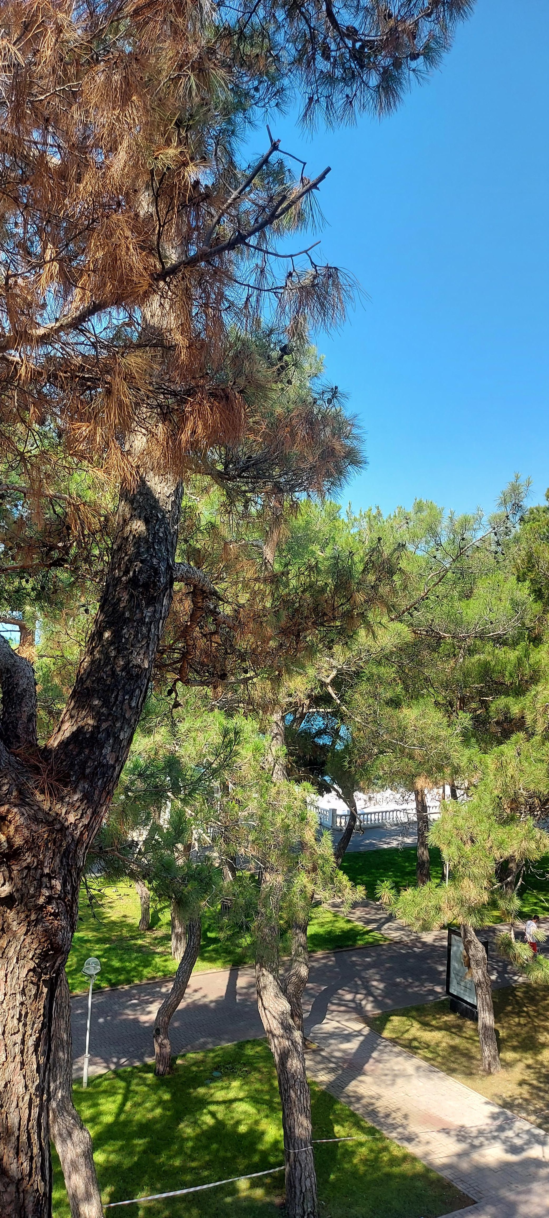 Прекрасный парк и вид на море, огромный выбор на завтрак, в самом центре набережной.